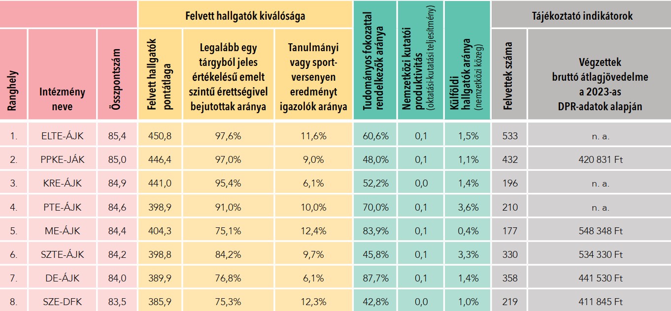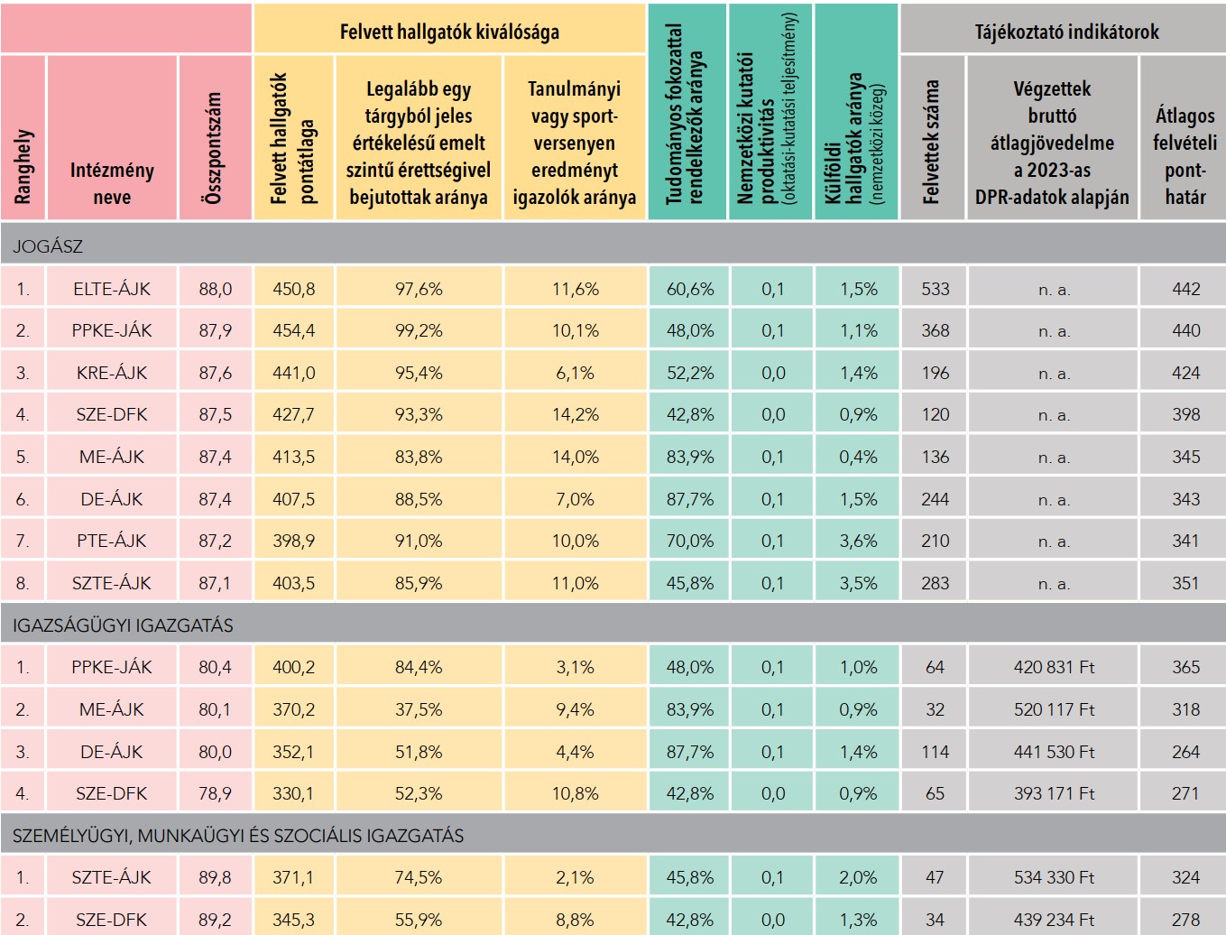 A szakrangsort a PPKE-JÁK (80,4 pont) vezeti, második az ME-ÁJK (80,1), harmadik a DE-ÁJK (80). A bekerülési pontszámok közül a PPKE-JÁK átlagpontszáma (400,2 pont) a legmagasabb. A többi intézményhez képest ide jóval nehezebb volt bekerülni, így a jeles emelt szintű érettségivel bejutók aránya is itt a legmagasabb (84,4 százalék). Az oktatói minősítettségben a DE-ÁJK (87,7 százalék) és az ME-ÁJK (83,9) mutatja a legmagasabb arányt. A bruttó átlagos kezdő bér az ME-ÁJK (520.117 forint) végzettjei esetében a legmagasabb.