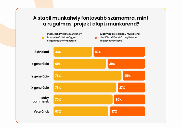 Sokszor hallani, hogy a fiataloknak „nem kell a stabilitás”. A kutatás viszont ennek szinte teljesen az ellenkezőjét mutatja. A Z generáció ugyanis ugyanúgy igényli a biztonságot, mint az idősebbek — csak mást ért alatta. Nem az egy évtizedig tartó céghűségben hisznek, hanem abban, hogy a jó munkahely garantálja a tanulást, a tisztességes fizetést és a kiszámítható körülményeket. Mindemellett a rugalmasság továbbra is erős elvárás, főleg a 18 év alattiaknál, akik már projektalapú munkavégzésben gondolkodnak. A szülői minták pedig azt tanították meg nekik: az egyoldalú hűség sokszor nem működik, így a tudatos karrierváltás számukra természetes.
