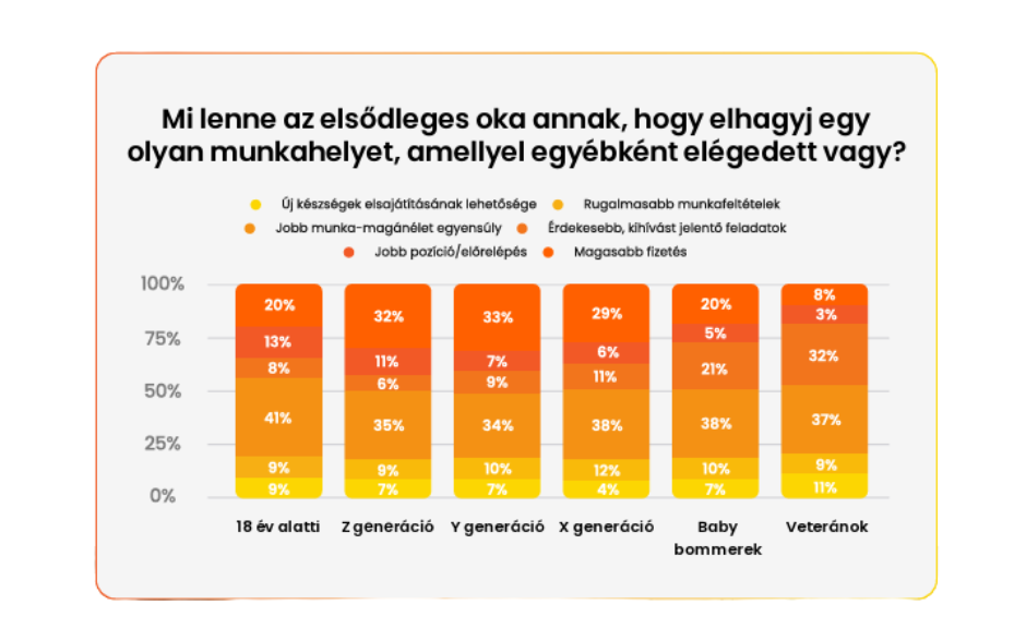 A munka–magánélet egyensúlyáról gyakran állítják, hogy ez a Z generáció „mániája”. A számok viszont mást mutatnak: minden korosztály számára ez lett az egyik legfontosabb munkavállalói igény. A Quantum kutatása alapján ez az elsődleges oka annak, ha valaki otthagyna egy egyébként jó munkahelyet — legyen szó akár 18 év alattiakról, akár Baby Boomerekről. A Z generáció azonban még egy lépéssel továbbmegy: nem csak egyensúlyt, hanem élhető életet akar. Számukra az egészséges életmód, a mentális jóllét és a szabadidő ugyanolyan része a sikernek, mint a szakmai előrelépés.