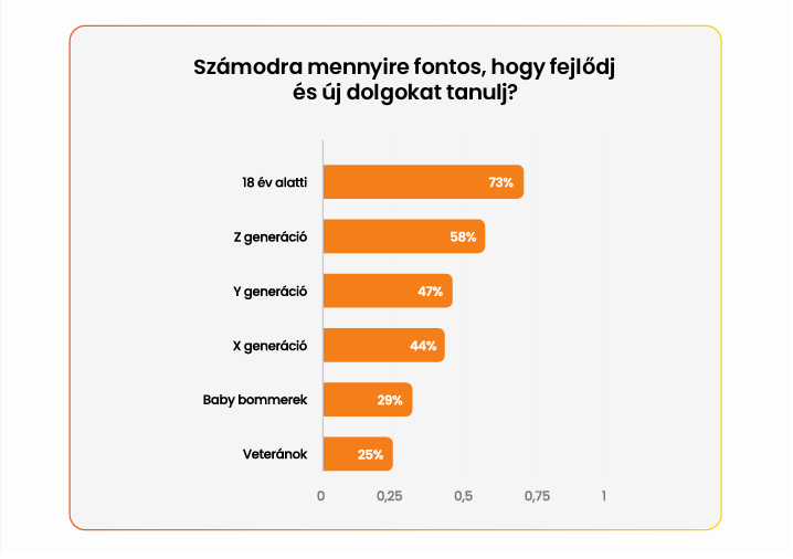 A felmérés egyik legmarkánsabb megállapítása, hogy a 21. század fiataljai számára az önfejlesztés nem trend, hanem életforma. A Z generáció 58 százaléka tartja „rendkívül fontosnak”, hogy folyamatosan új dolgokat tanuljon – ez kiemelkedően magas arány a többi korosztályhoz képest. A kutatók szerint a Z-sek világában a folyamatos fejlődés annyira alapvető, mint a korábbi generációknál a stabil munkahely: ez lett a karrierépítés első számú motorja. Nem véletlen, hogy ennek megfelelően rövidebb ciklusokban is gondolkodnak. A többség szerint 3–4 év alatt ki lehet maxolni egy munkahely kínálta tanulási lehetőségeket, és utána jöhet a következő lépés.