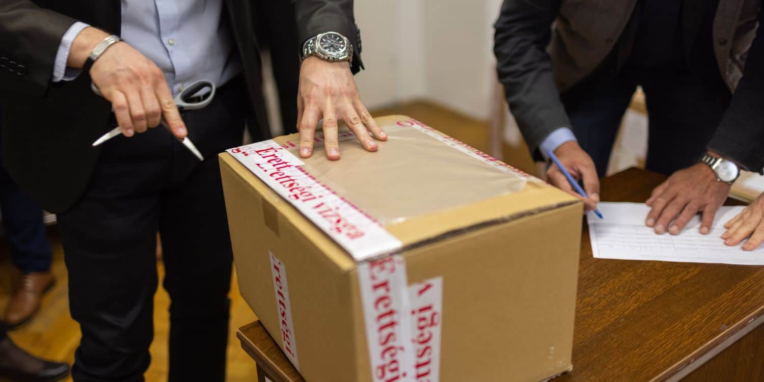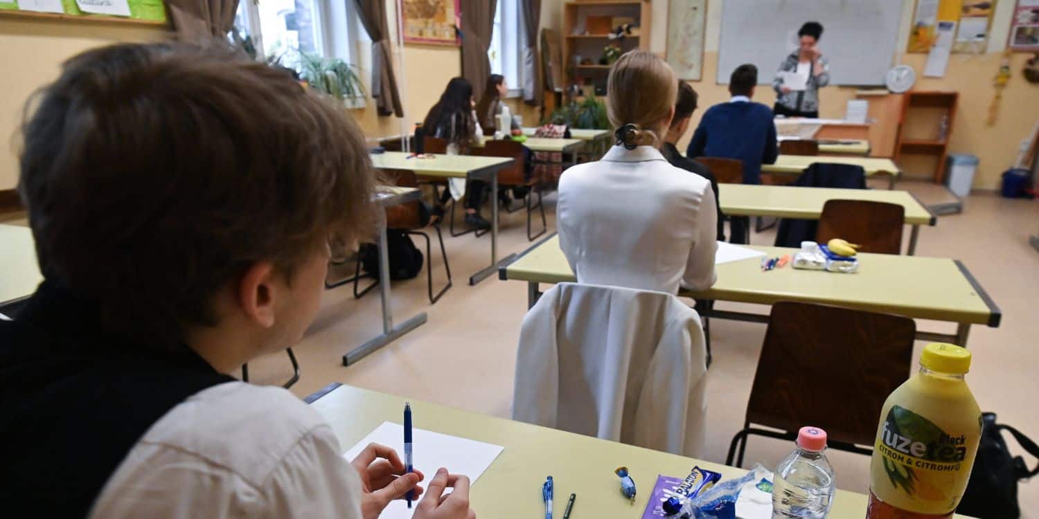 Kiosztják a feladatlapot tartalmazó borítékot a történelem középszintű írásbeli érettségi vizsgán a győri Fehér Miklós Labdarúgó Akadémia Gimnáziuma és Kollégiumában 2023. május 10-én. (Fotó: MTI/Krizsán Csaba)