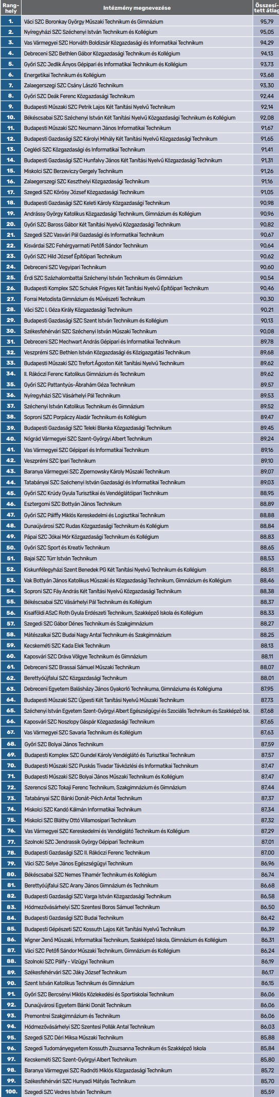 A listán 100 iskola szerepel, ezek közül 82 vidéki, ami jelzi, hogy nem csak Budapest kínál versenyképes technikumi oktatást, és a legjobbak vidékről kerülnek ki. A legtöbb vármegyéből legalább egy iskola szerepel a rangsorban, sok vármegyeszékhelyi, de több kisebb városi iskola is kiválóan teljesített. A rangsorban található technikumok döntő része állami fenntartású, de több egyetemi vagy magánfenntartású intézmény is bekerült a legjobbak közé. Az egyházi fenntartású intézmények is jól szerepeltek, a rangsorban hét katolikus technikum is helyet kapott, többek között Egerből, Kalocsáról, Pannonhalmáról és Sátoraljaújhelyről. Ez azt is jelzi, hogy a fenntartó típusa – legyen az állami, egyházi vagy alapítványi – nem meghatározó, ha a magas színvonalú szakmai munkát vizsgáljuk.